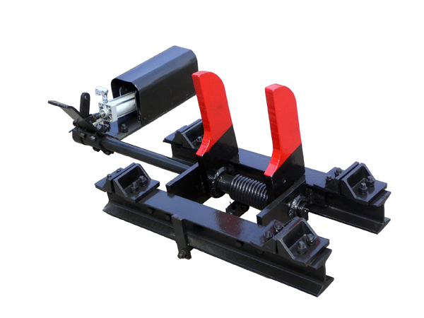 本實(shí)用新型公開(kāi)了一種氣動(dòng)阻車(chē)器,包括刀擋、扭簧、力把、氣缸、軸架、軸、限位板和拉桿,軸架固定在限位板上,軸的遠(yuǎn)端穿過(guò)扭簧鉸接在軸架上,刀擋固定在軸上并與扭簧上端連接,扭簧下端固定在拉桿上,力把下端固定在軸的近端,力把上端與氣缸鉸接。該氣動(dòng)阻車(chē)器結(jié)構(gòu)簡(jiǎn)單,安全可靠,可以人工控制,也可以遠(yuǎn)程控制,實(shí)現(xiàn)集中自動(dòng)化管理。